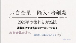 六白金星 九星気学|六白金星の陥入・暗剣殺の最大の特徴 なんとなく進まない判断に迷いが出ることはありませんか?今感じている違和感には理由があります。この違和感に心当たりがある方へ今の違和感の正体を知る流れを理解することで選択が変わります。2026年は九星気学では一白水星が中宮に入る年です。この年... 2026.04.17 六白金星