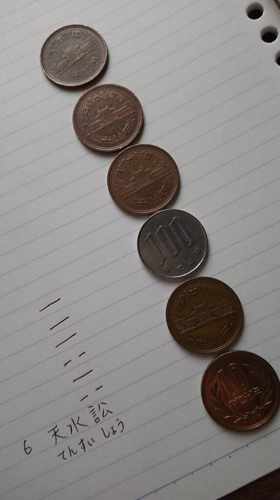 - コイン6枚を両手の中に入れて「来年の心構えを教えてください」または「来年の私の学びを教えてください」と3回くらい唱えながらシャッフルする